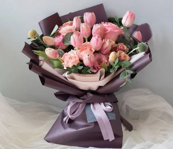 Celebrate special moments with the Elegant Blush Tulip & Rose Bouquet, a mesmerizing combination of delicate pink tulips, lush roses, and elegant fillers, all wrapped in a sophisticated dark purple wrapping. This bouquet is a true expression of love and admiration, perfect for making anyone feel cherished.