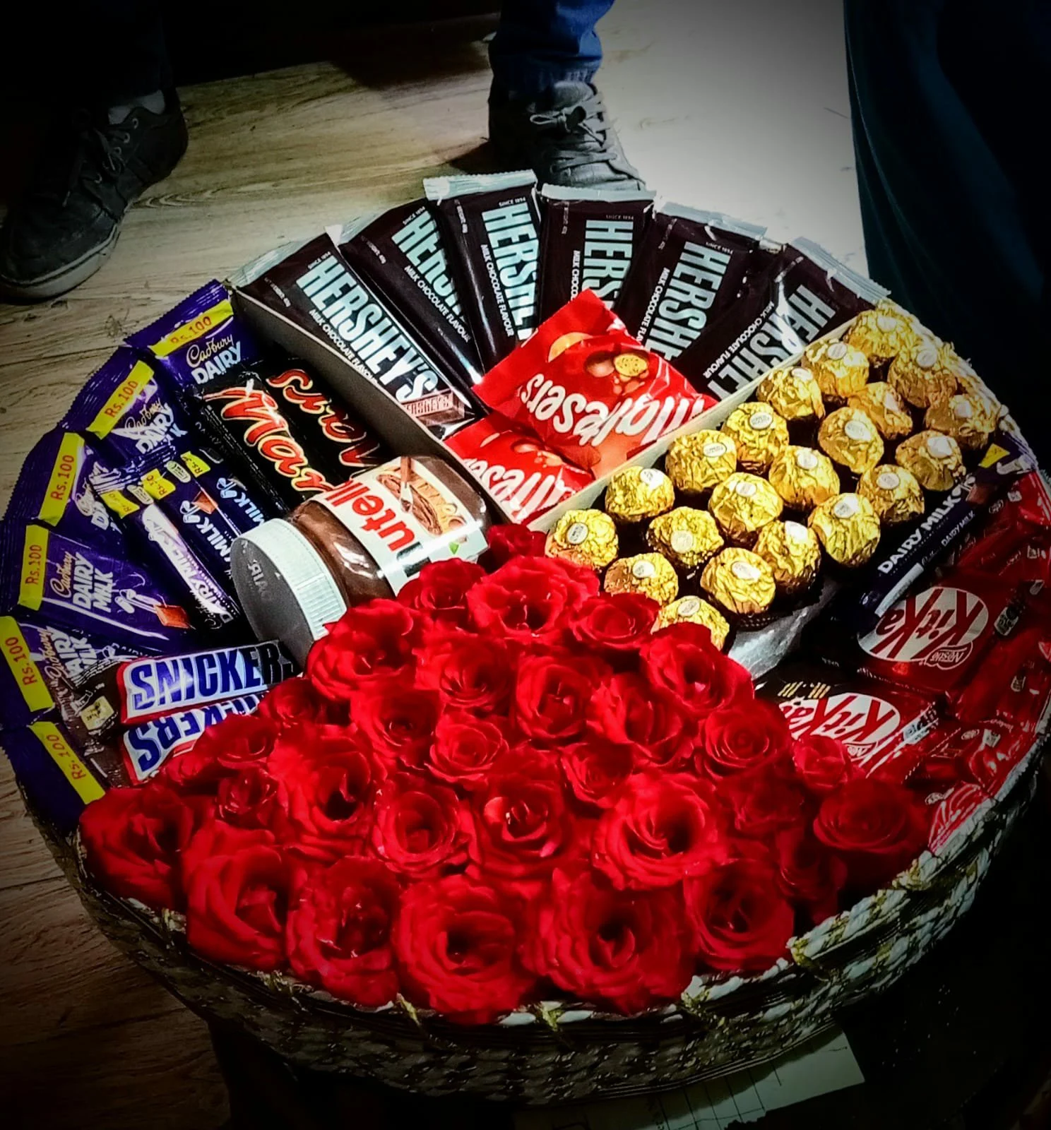 Complementing the sweetness, the stunning fresh red roses add a romantic and charming touch, making this basket an ideal gift for special occasions like birthdays, anniversaries, Valentine’s Day, Eid, weddings, or any grand celebration.