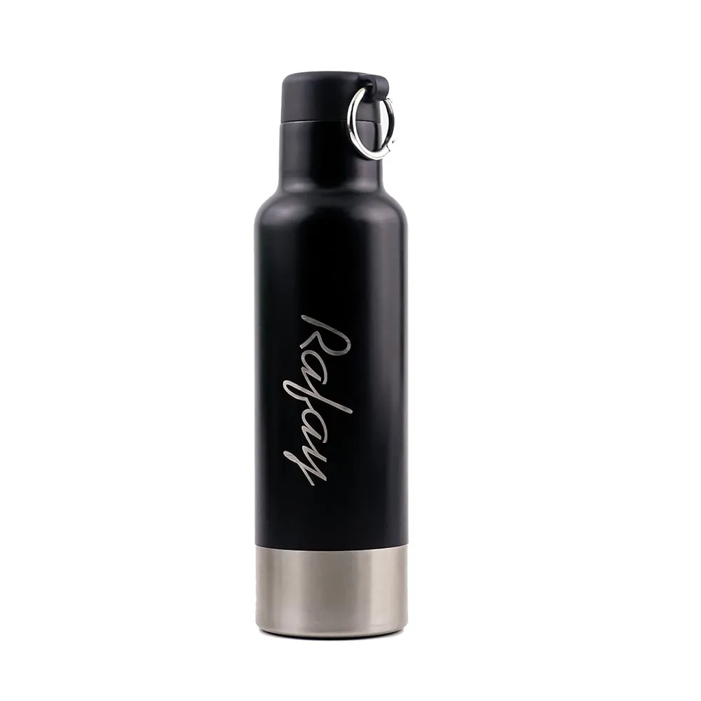 What makes this bottle truly special is the custom engraving feature, allowing you to personalize it with a name, making it a thoughtful gift for loved ones or a stylish addition to your daily essentials. The bold black matte finish, combined with a sophisticated silver base, adds a modern touch, making it an ideal choice for both men and women.