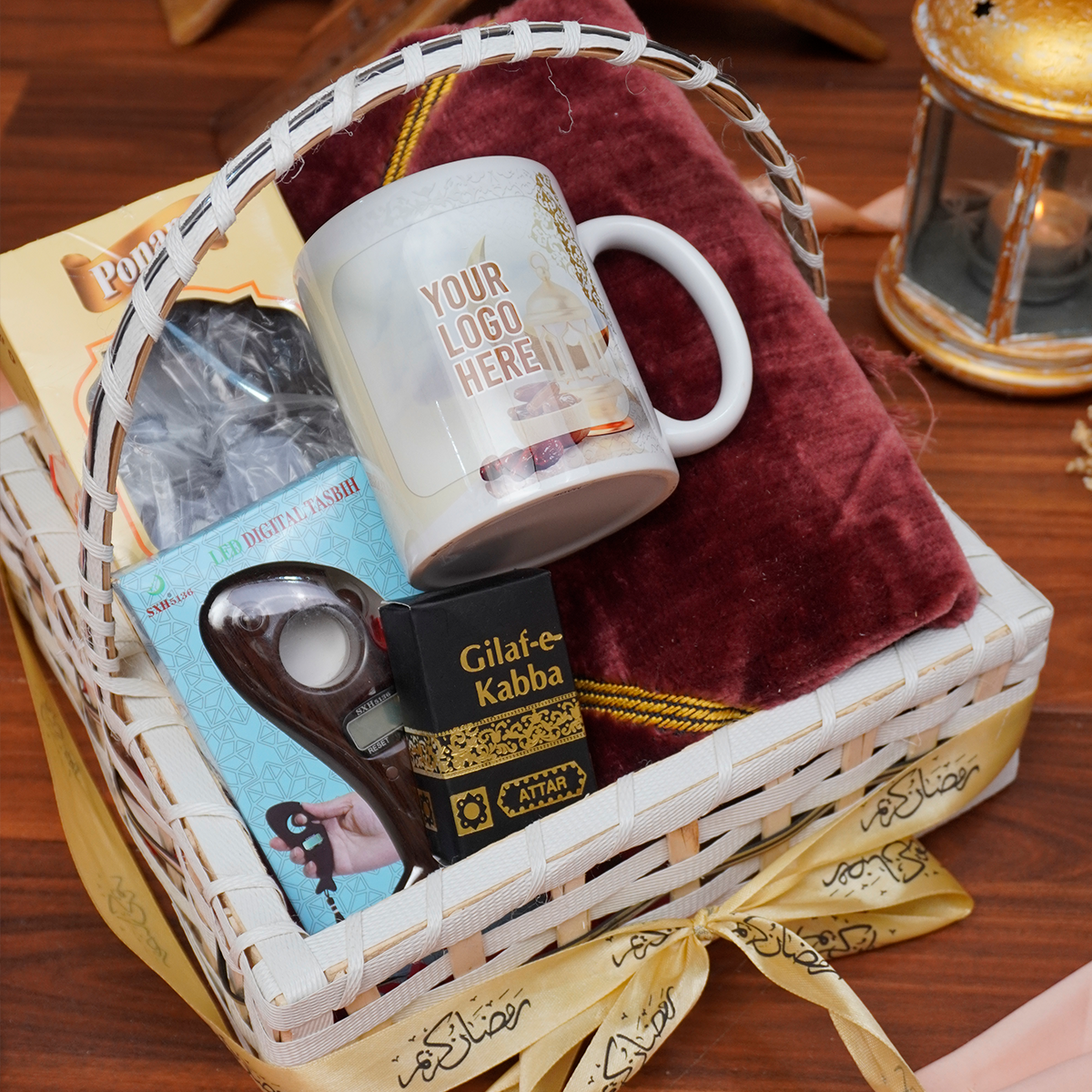 Inside this exquisite hamper, discover a beautifully personalized mug that can be customized with your logo or a heartfelt Ramadan message, adding a unique personal touch to your gift. The luxurious velvet prayer mat included in the hamper offers comfort for prayerful moments, elevating your spiritual experience.